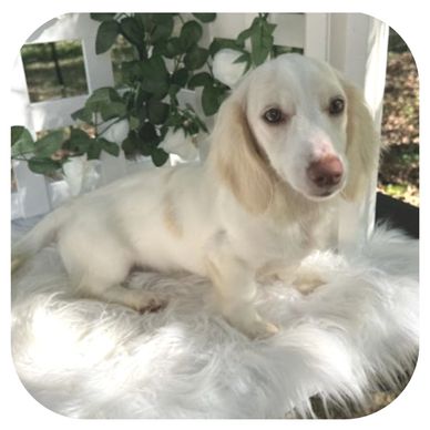 Madalynn was the youngest to move on to a pet home when I broke my arm. Madalynn was my first smooth coat cream but she never got the chance to have any puppies here with me. Someday I will get another. Madalynn was the daughter of Jenni & Theo